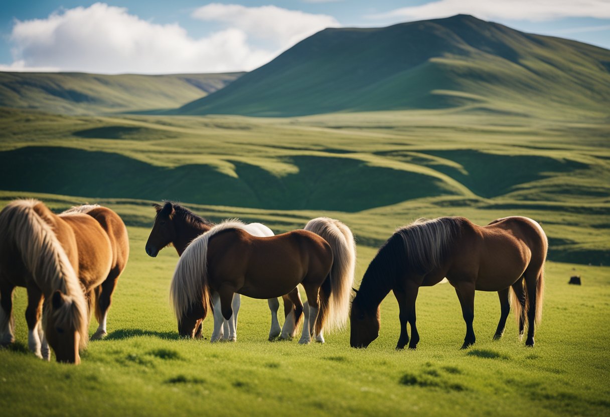 Et fredelig landskap med bølgende grønne bakker og en gruppe islandske hester som beiter på frodig, livlig gress under en klar blå himmel